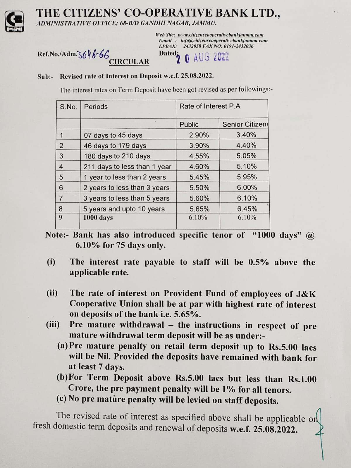 Rate of Interest on Deposits w.e.f 25.08.2022