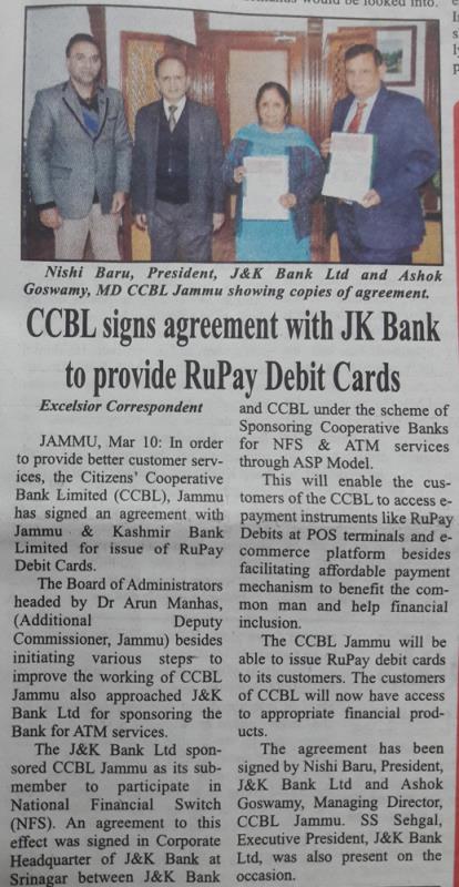 CCBL signs agreement with JK Bank to provide RuPay Debit Cards.