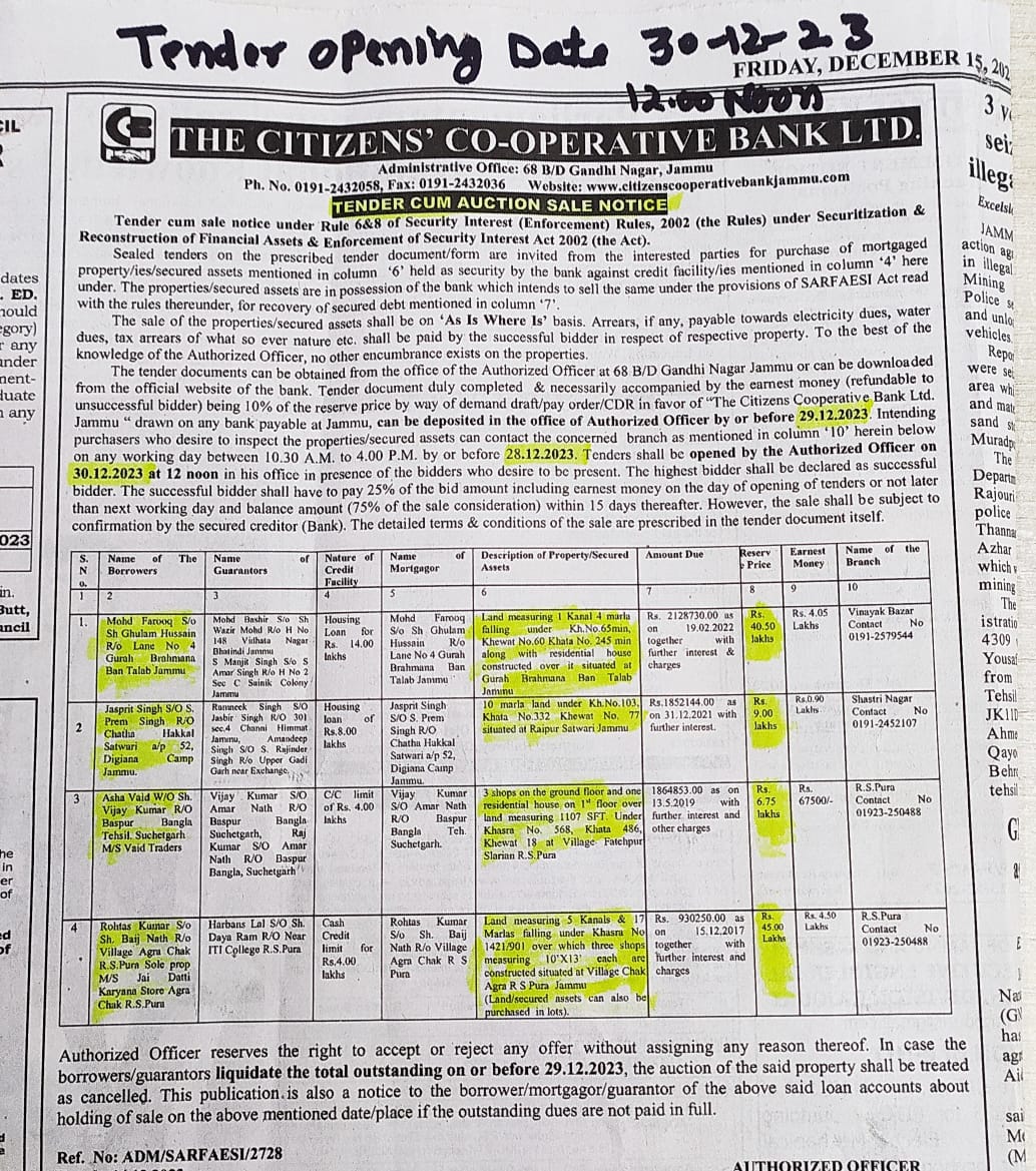 New Tender cum sale notice for auction of properties