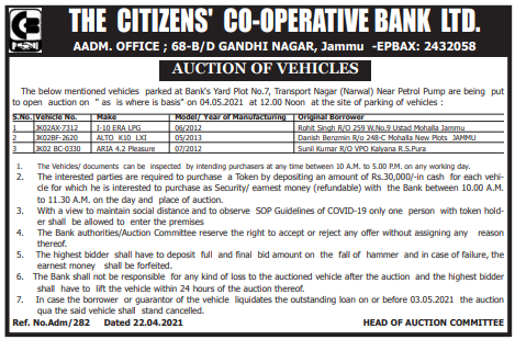 Notice for Auction of Vehicles