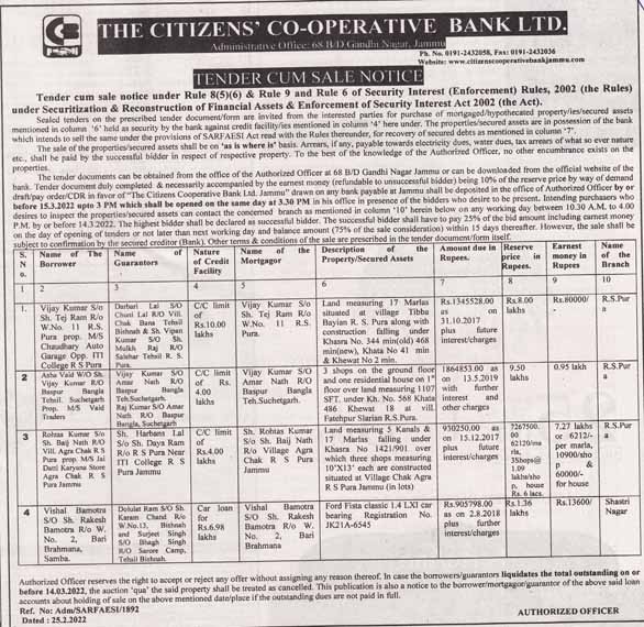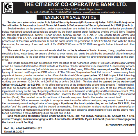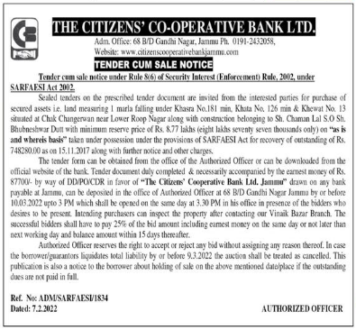 Tender cum sale notice for auction of properties