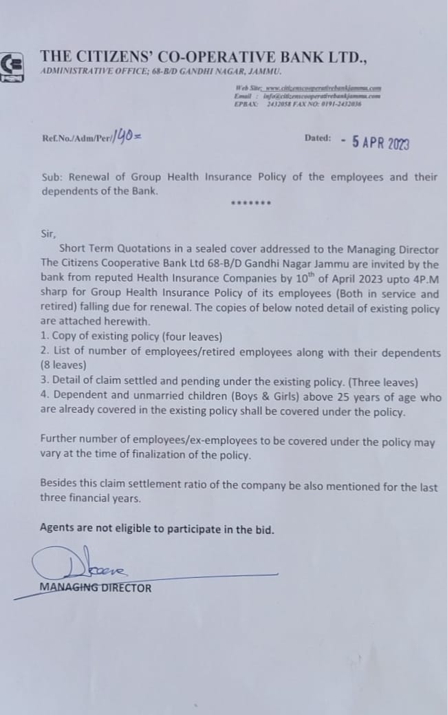 It is for information of all the concerned that the last date of receipt of Short Term Quotations for Health Insurance Policy of the Bank fixed as 09.04.2020 has been extended up to 15.04.2020 at 02:00 PM sharp for the reason of updation of list of claims settled during the year.